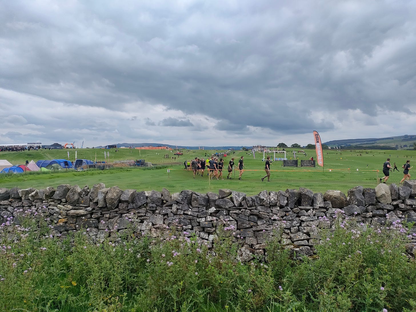 From the car park, a field with very organised volunteers, we walked towards the course and whether this was by design or not, every person entering this race has to walk under this climbing frame (see below)