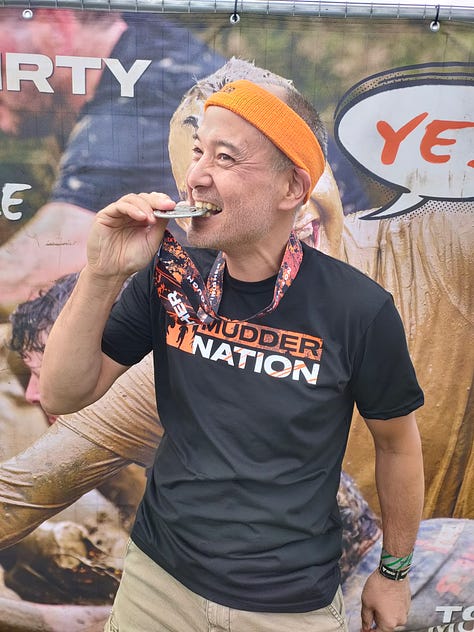 The 5K course around fields, included walking across a high beam about five feet from the ground, crawling through the mud under barbed wire, and jumping in a ditch of cold dirty water onto what's advertised as the Blockness Monster. Imagine the casing of a Toblerone on a spit, spun by the power and momentum of people getting over it. Once you're over you reach back, still waist deep in water and using your weight as leverage pull it over so others can be pulled over. His was repeated three times.